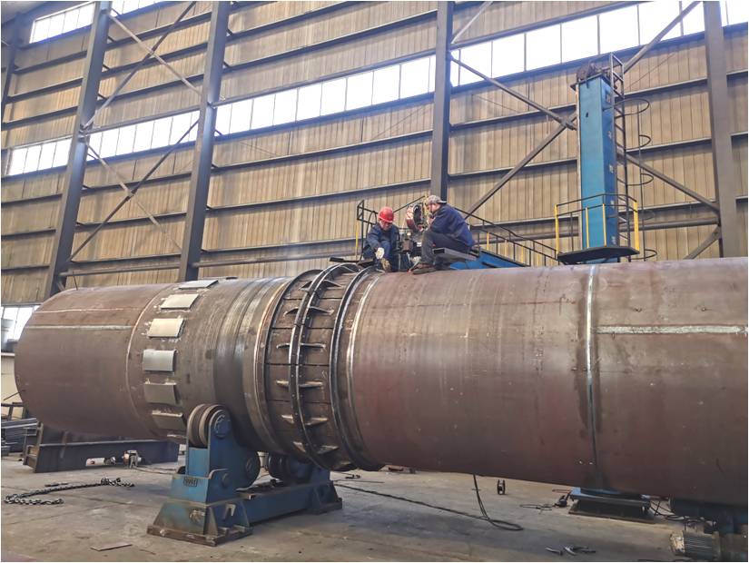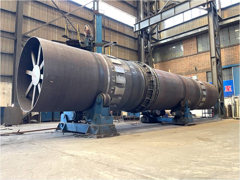 公司重點(diǎn)項(xiàng)目φ2.336×14m冷卻機(jī)筒體在成套廠鉚焊車間快速推進(jìn),組對(duì)交檢合格后進(jìn)入下道涂裝工序。